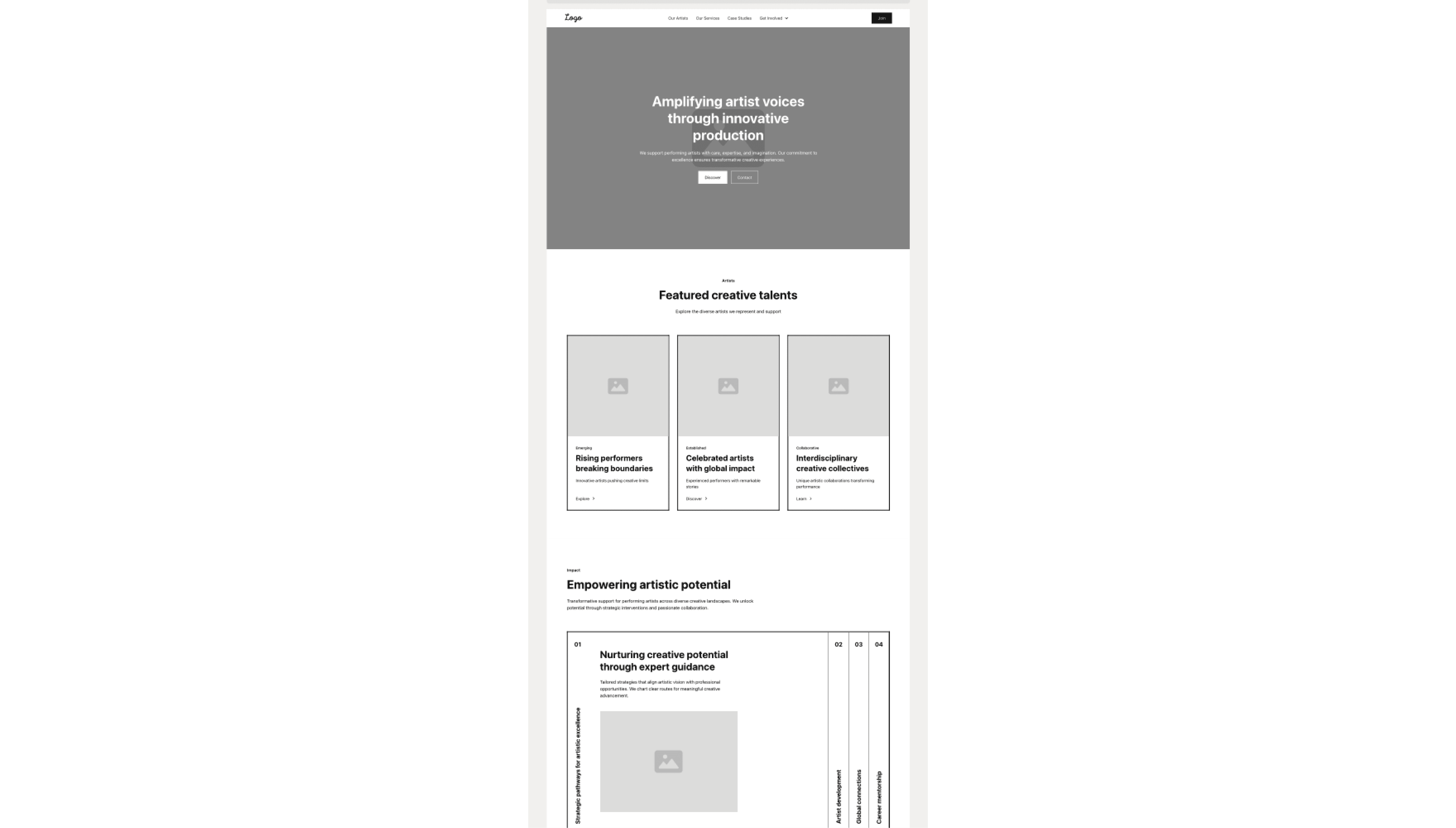 Early homepage wireframe used to establish content hierarchy and section flow prior to high-fidelity design.