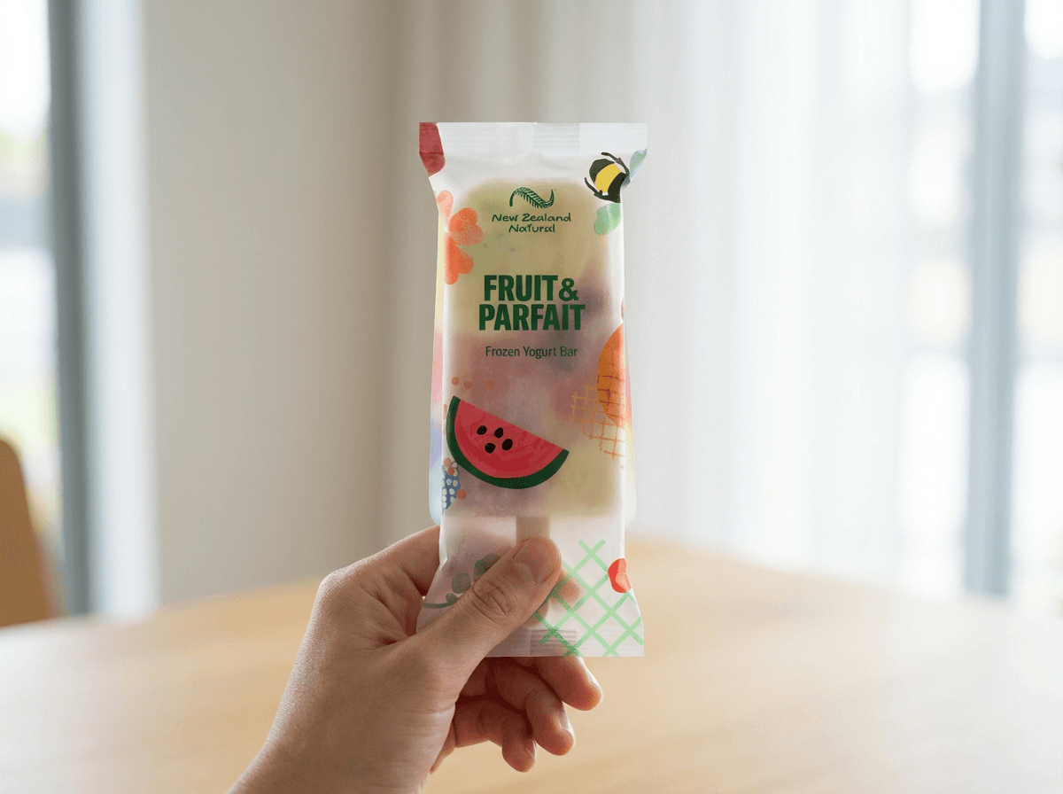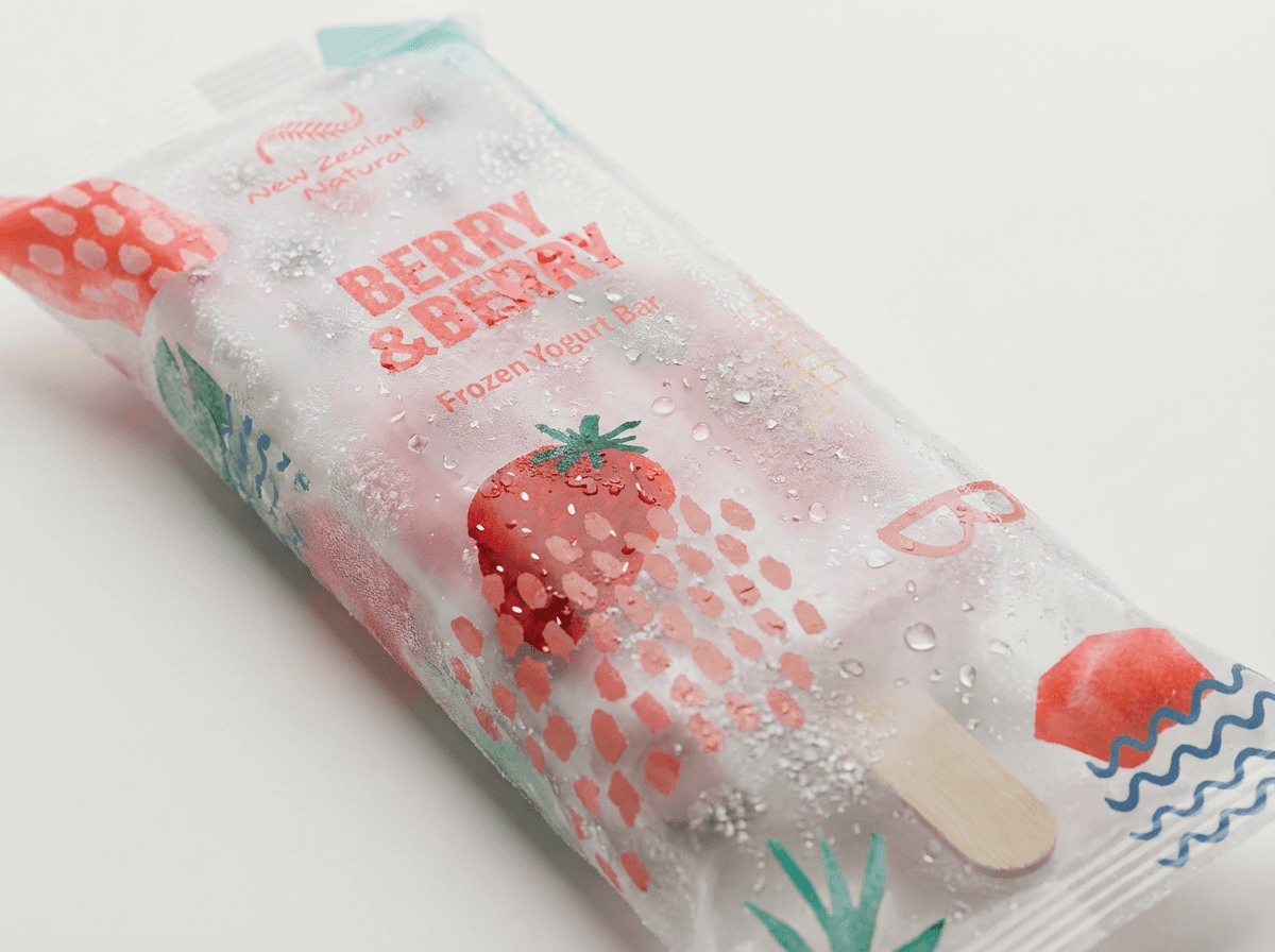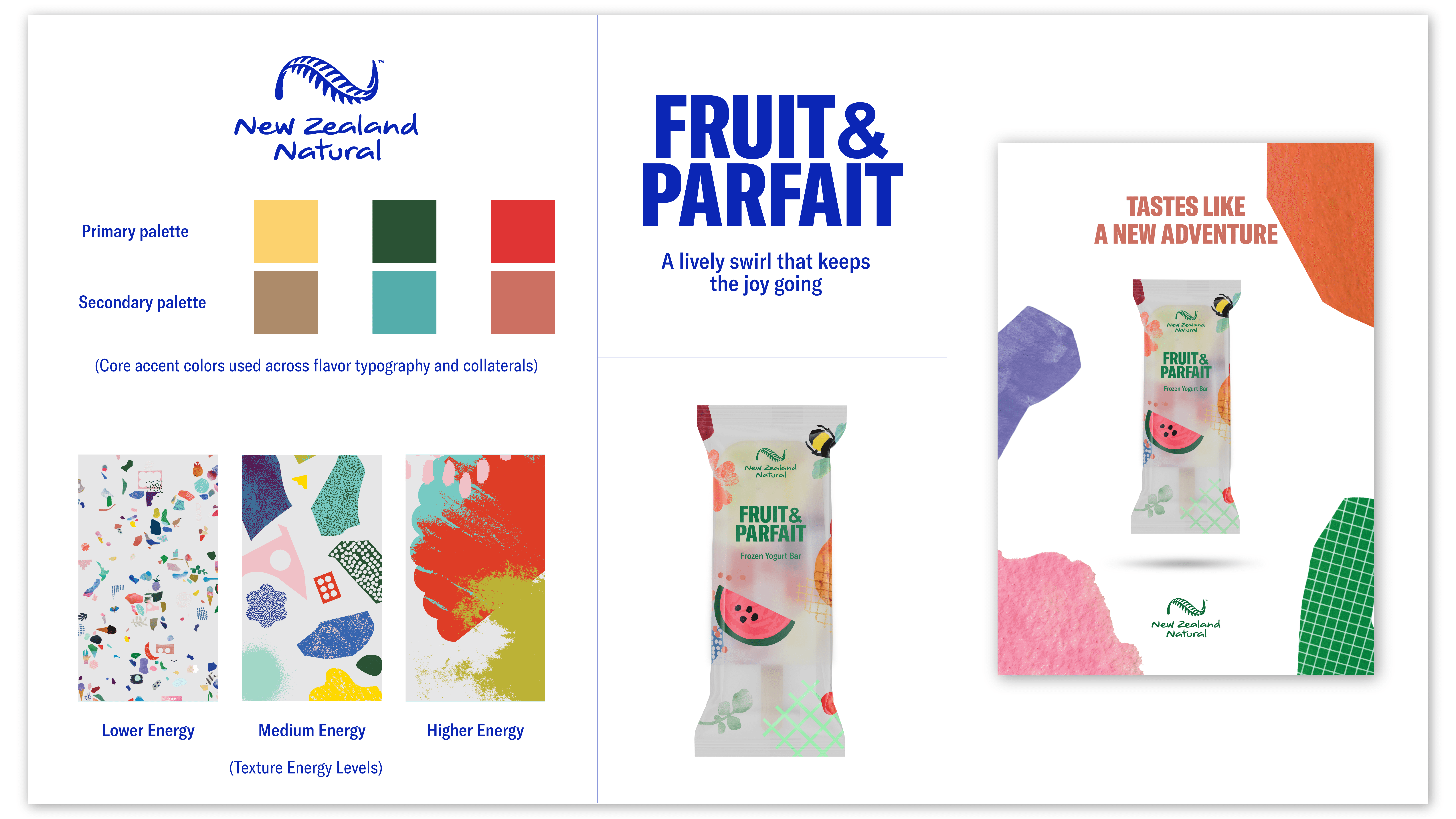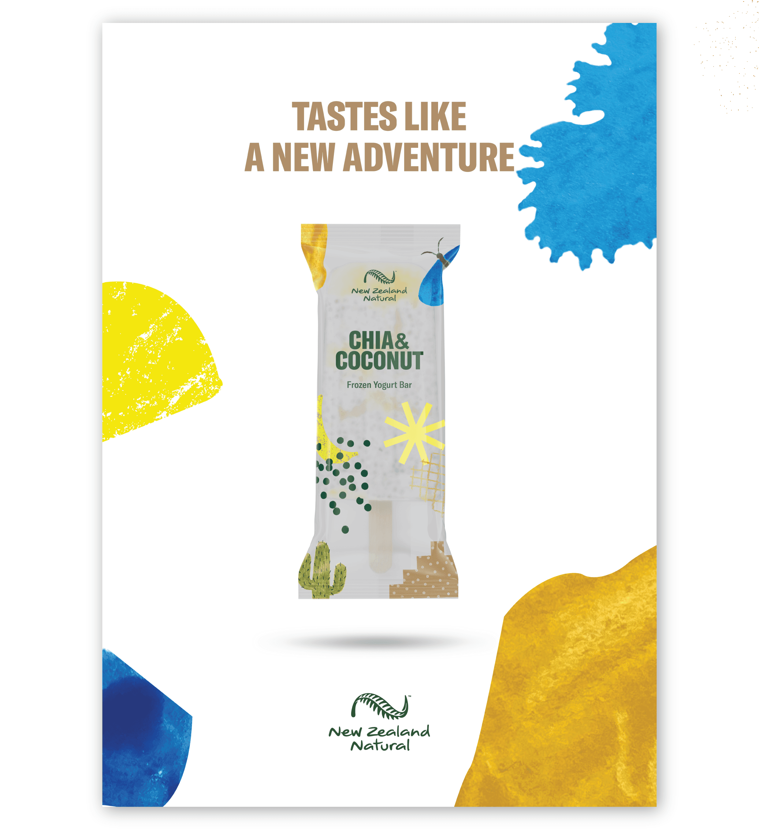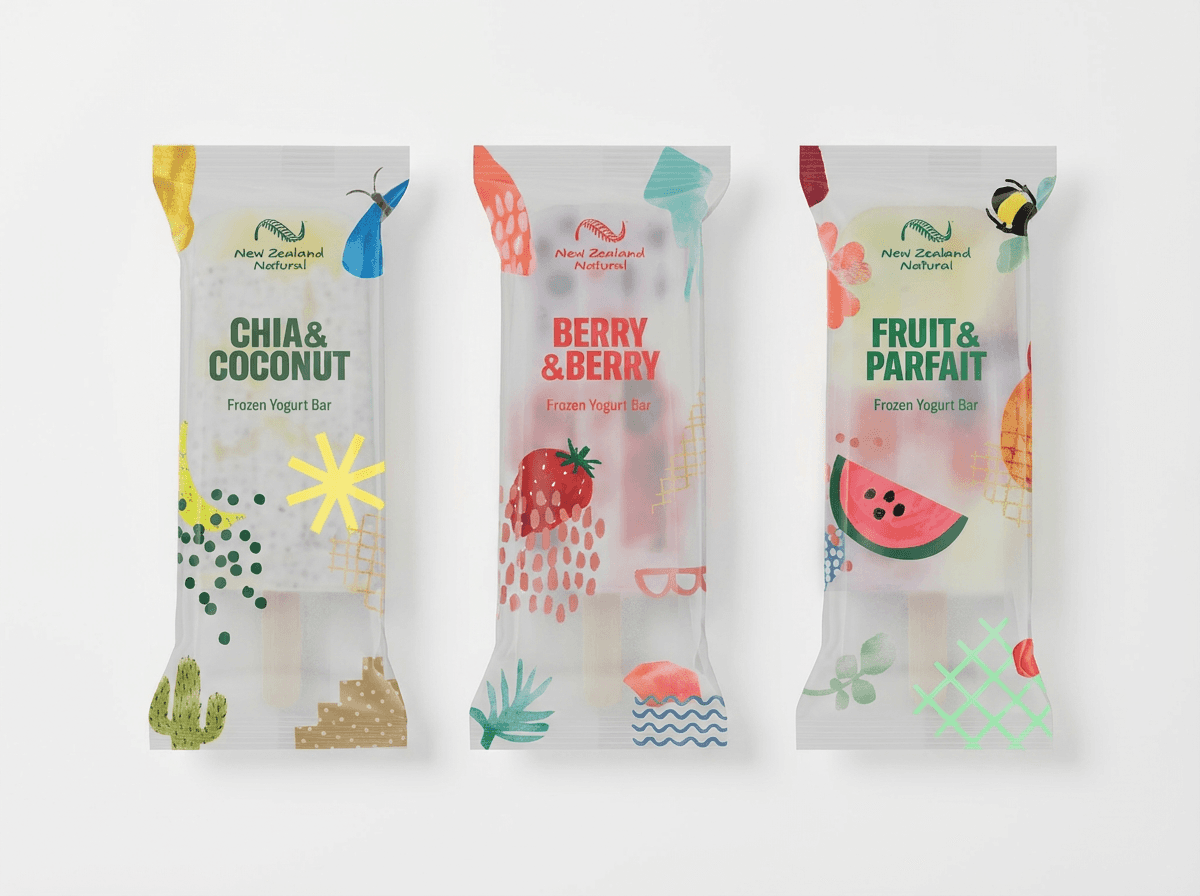 A packaging and visual system concept exploring how New Zealand Naturals’ relaxed, familiar brand could extend into an on-the-go frozen yogurt bar format without disrupting its existing retail presence.